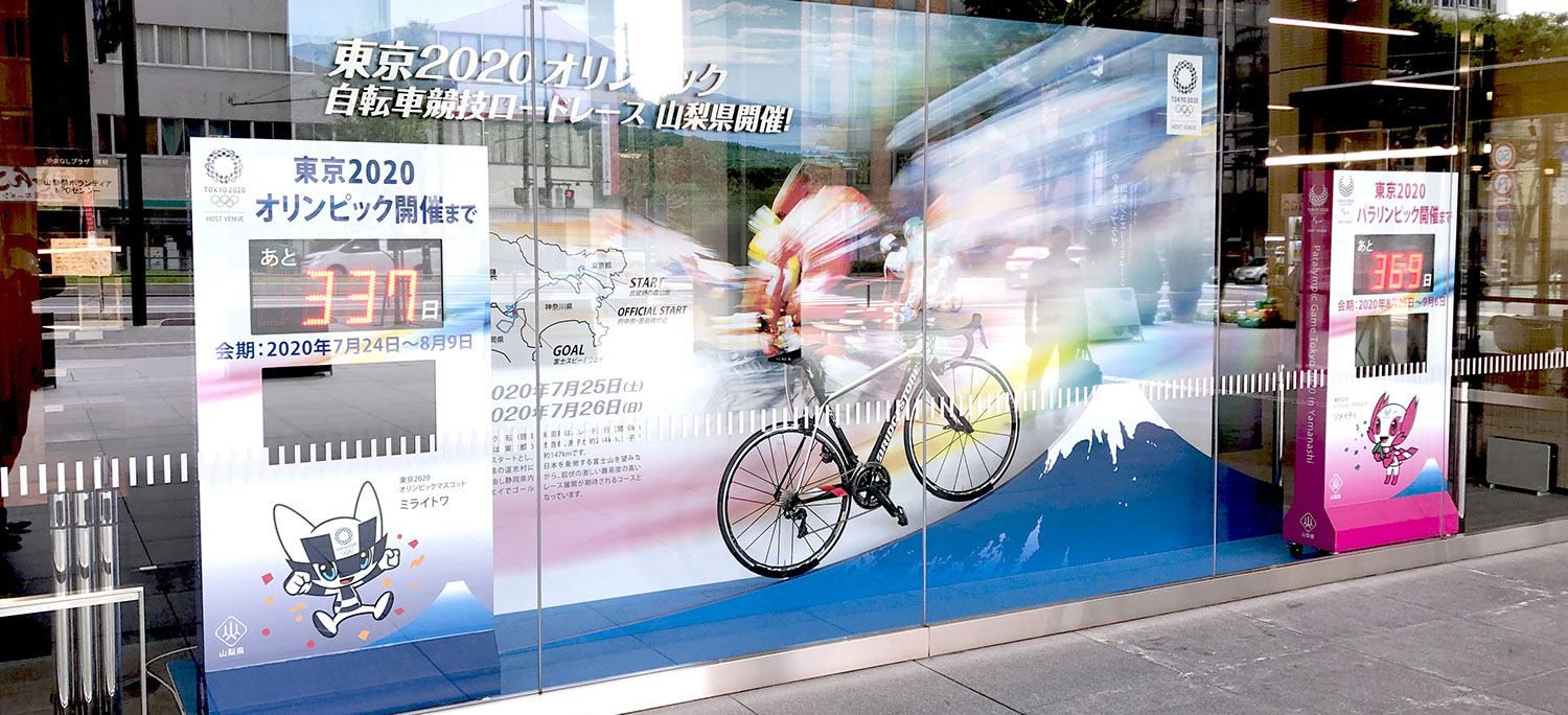 2020東京オリンピック開催デイ・カウンター(山梨県庁防災新館やまなしプラザ「県民ひろば」&JR甲府駅&河口湖ショッピングセンターベル)ディスプレイのプランニング&デザインを制作いたしました。※自転車競技事前告知イベントポスター含む。